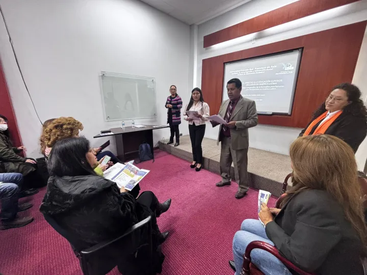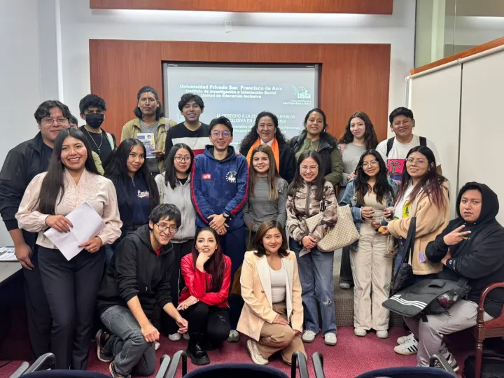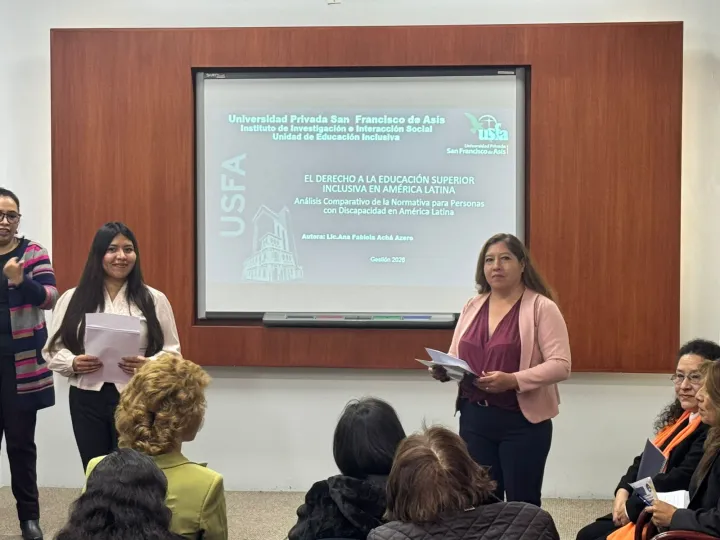 2026-04-28 08:26:51En el marco de las acciones institucionales orientadas a fortalecer la producción científica y el compromiso social universitario, el Instituto de Investigación e Interacción Social de la Universidad Privada San Francisco de Asís (USFA) llevó a cabo la presentación del libro “El derecho a la educación superior inclusiva en América Latina”, de autoría de la Lic. Ana Fabiola Achá Azero. El evento se desarrolló el pasado 17 de abril de 2026 en la Sala Multipropósito de la institución, congregando a autoridades académicas, docentes, estudiantes y representantes de organizaciones vinculadas a la discapacidad.