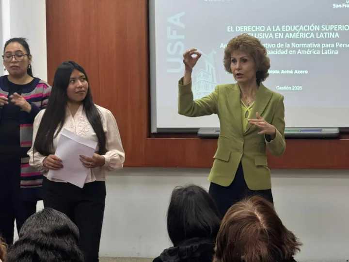 La Universidad Privada San Francisco de Asís (USFA) presentó el libro El derecho a la educación superior inclusiva en América Latina de Ana Fabiola Achá, generando un espacio de reflexión académica sobre inclusión. La autora expuso las brechas entre normativa y realidad en la región. Posteriormente, la MSc. Paola Ramos Marca y la MSc. Mabel Aguilar analizaron críticamente la obra, destacando su aporte científico y social. El evento contó con participación de autoridades, estudiantes y representantes de personas con discapacidad, incorporando elementos de accesibilidad como intérprete de lengua de señas. La actividad reafirmó el compromiso institucional con una educación superior inclusiva, equitativa y centrada en derechos humanos.